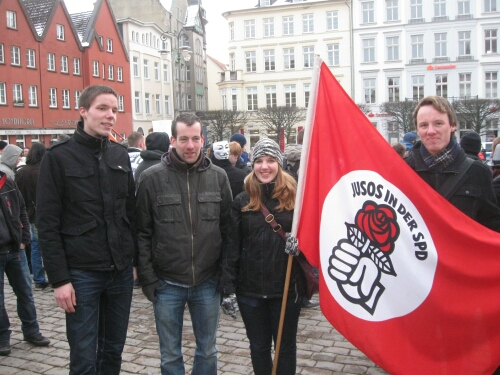 Unsere Hoffnungen haben sich erfüllt. Über 100 Menschen zogen am 11. Februar vom Grunthalplatz durch die Innenstadt, machten Halt am Marienplatz, auf dem Marktplatz und vor der Staatskanzlei, um dann zu einer abschließenden Kundgebung wieder auf den Marienplatz zurückzukehren! Noch erfreulicher war der Umstand, dass das Publikum außerordentlich jung war, was zeigt, dass hier junge Menschen zur Demo erschienen sind, denen ACTA nicht egal ist und die befürchten, von den möglichen Einschränkungen in Sachen Datenschutz und Meinungsfreiheit direkt betroffen zu sein. Wir Jusos waren mit insgesamt 7 Personen vor Ort, wobei wir auch Unterstützung von den Jusos Wismar bekommen haben, denen wir an dieser Stelle herzlich danken wollen.