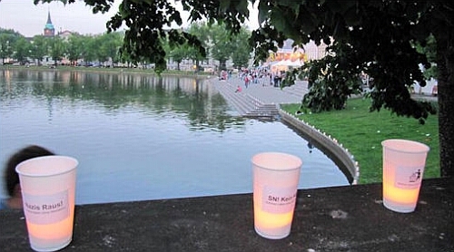 Am vergangenen Samstag traf sich das von den Jusos Schwerin und der Initiative „Endstation Rechts“ ins Leben gerufene Bürgerbündnis „Schöner leben ohne Naziläden“ zu einer weiteren Protestaktion gegen Nazis und Rechtsextremismus. 20 Mitglieder des Bündnisses stellen in der Schweriner Innenstadt Teelichter auf, auf denen eindeutige Statements gegen Rechts angebracht waren. Flyer wurden ebenfalls verteilt. So erstrahlten die Treppe am Südufer des Pfaffenteiches, die Domtreppe, die Schmiedestrasse, der Markt und der Schlachtermarkt auch nach Einbruch der Dunkelheit noch in demokratischem Licht.